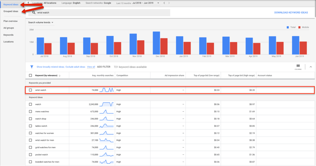As shown above, there are around ‘74000’ average monthly searches for the term ‘wrist watch.’