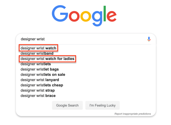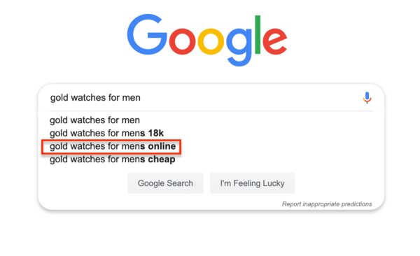 If I type in the phrase ‘gold watches for men’ I’m instantly presented with a keyword – gold watches for men online – that represents a potential opportunity.