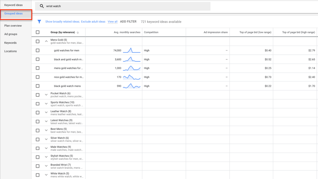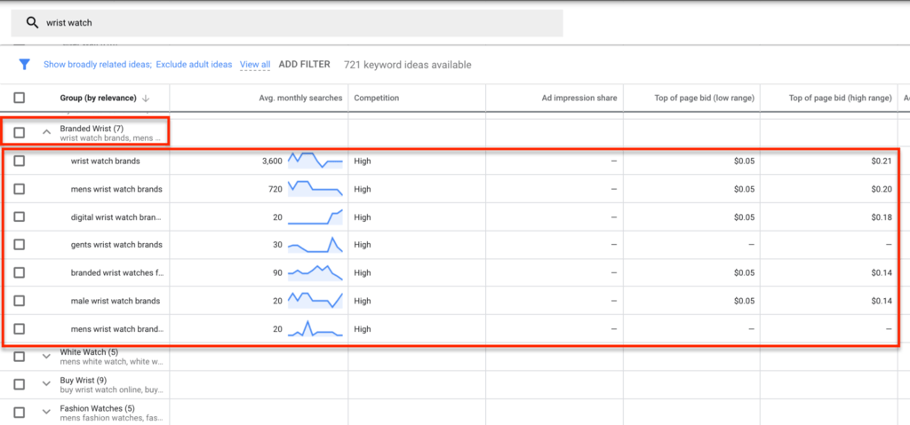As shown in the above image, a wide range of Keyword Groups have been returned in relation to the seed keyword ‘wrist watch.’