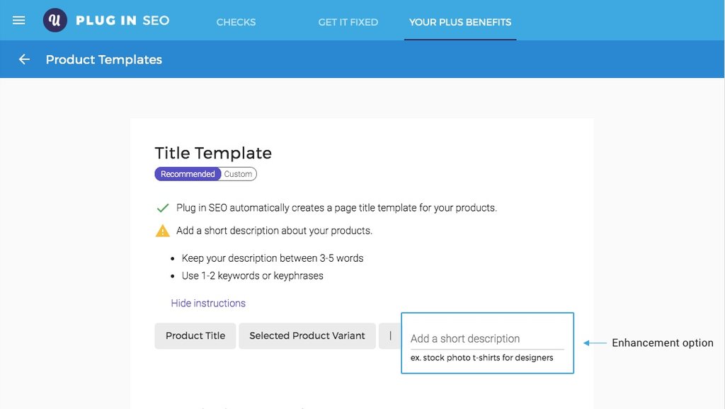 Here is an example of ‘Product Page Title’ template from Plug in SEO: